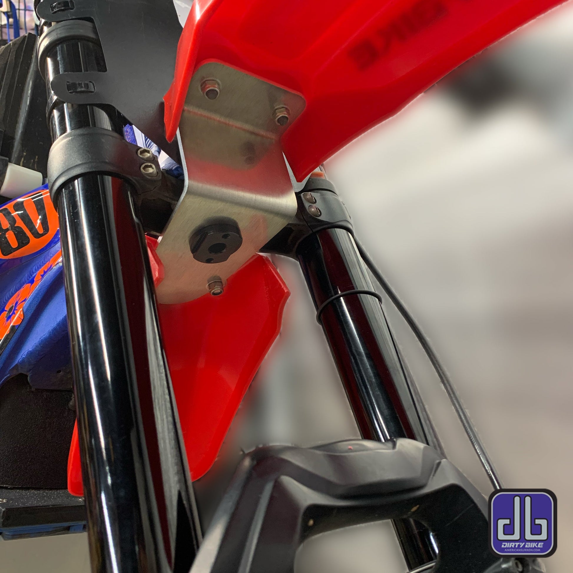 DirtyBike high mount fender kit raises any standard fork with a lower leg crossover stanchion, including Fox Float 40 and Marzocchi Bomber 58.